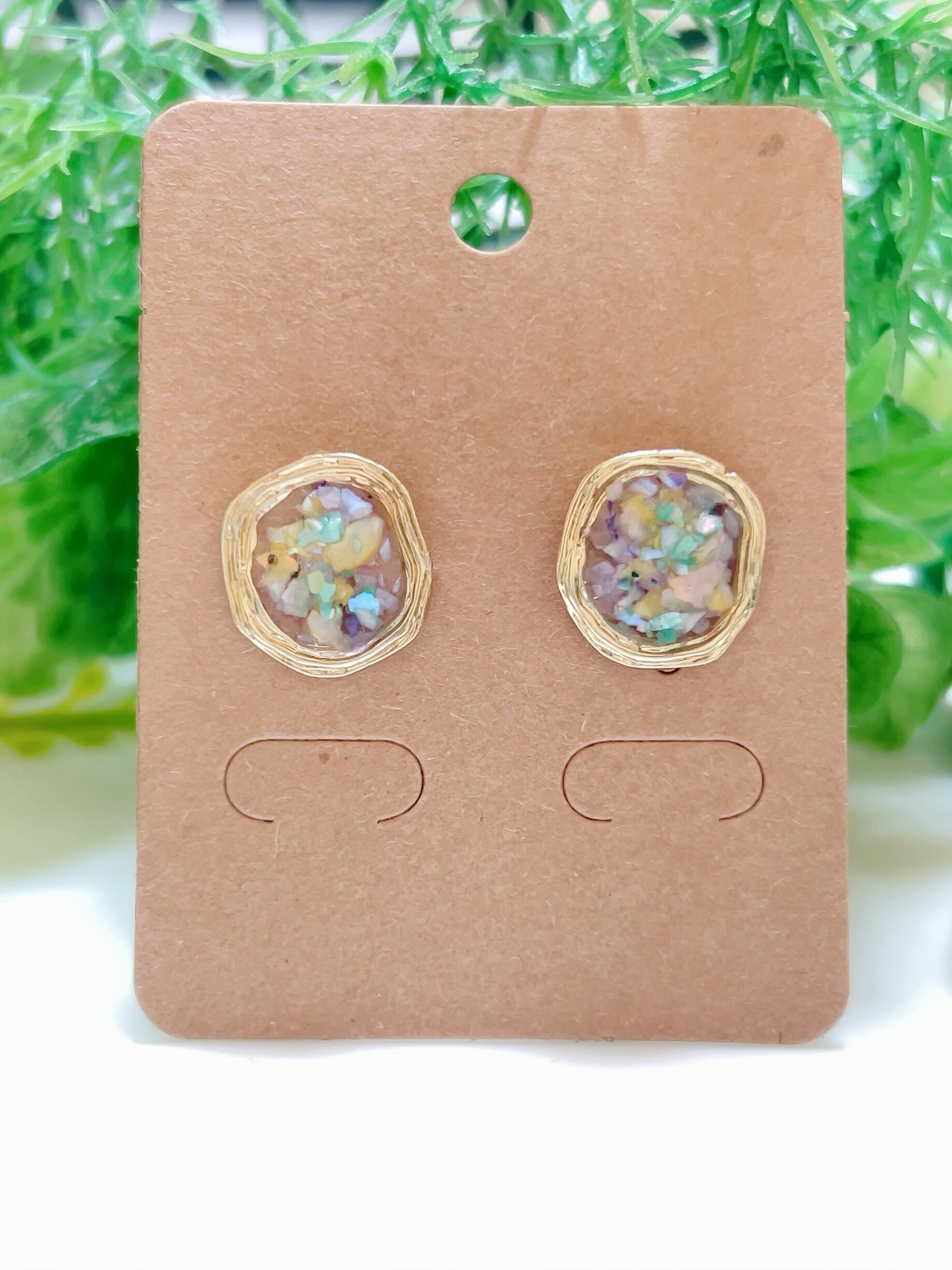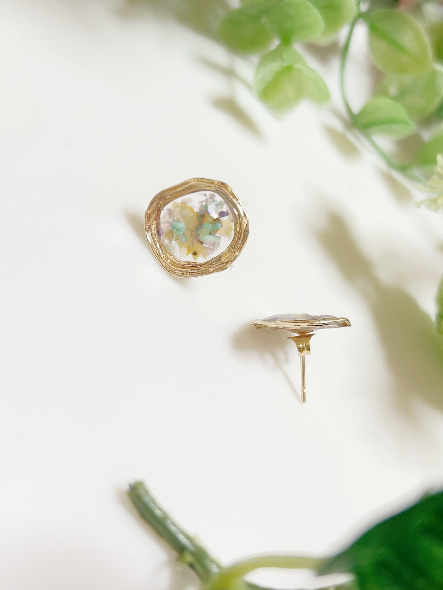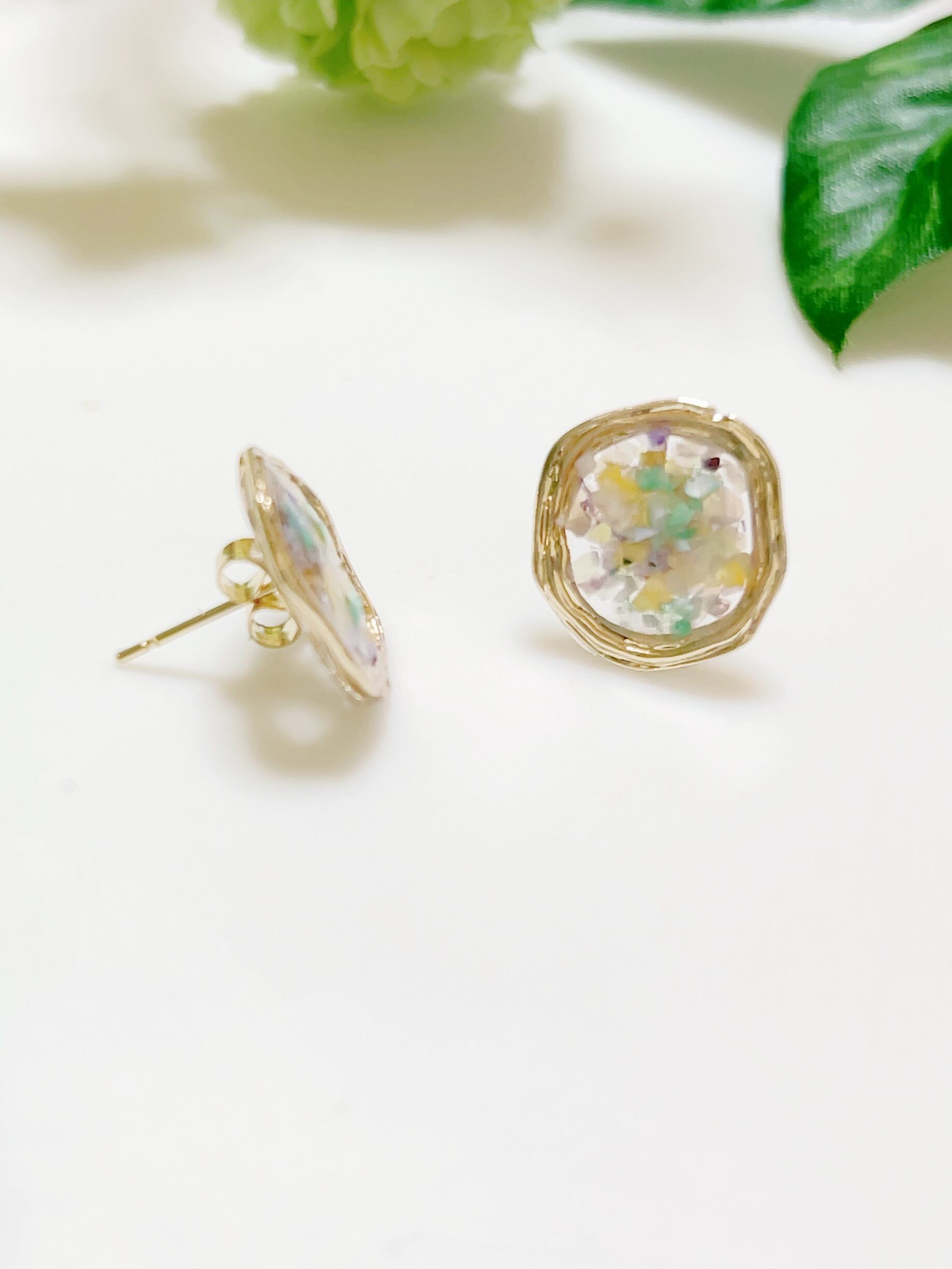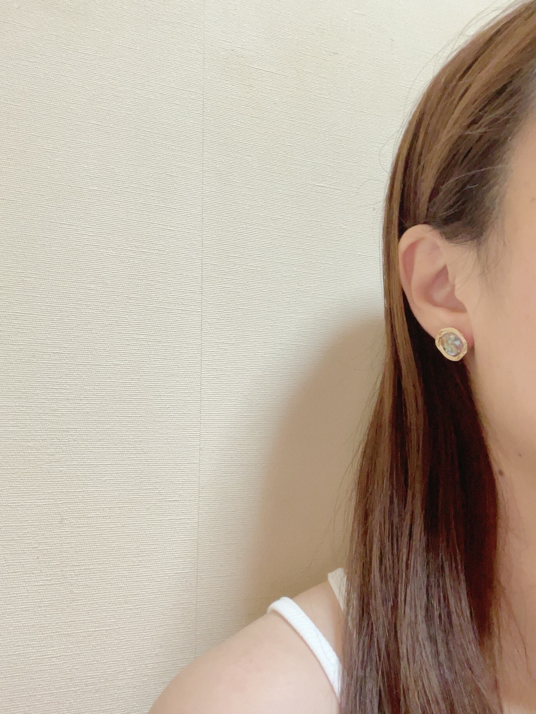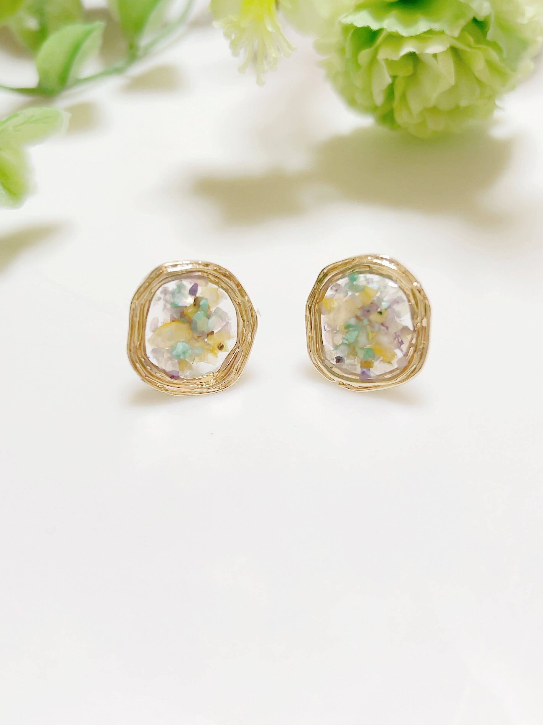 ミルキーな色合いの夏カラーなシェルを沢山詰め込みました。動く度に色の変化を楽しむ事ができ、耳元を華やかに彩ります。